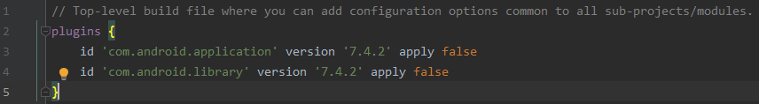 plugins {}의 com.android.application과 com.android.library 플러그인은 Android 애플리케이션 및 라이브러리를 빌드하는 데 사용됩니다. apply false 옵션은 이 빌드 스크립트가 플러그인을 적용하지 않고, 하위 프로젝트 또는 모듈에서 각각 적용하도록 설정한다는 것을 의미합니다.