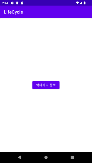 4. [액티비티 종료]버튼을 클릭하여 finish()를 호출합니다. finish()는 액티비티를 종료하는 함수로 onPause() -> onStop() > onDestroy()순으로 콜백이 호출하며 액티비티가 종료됩니다.